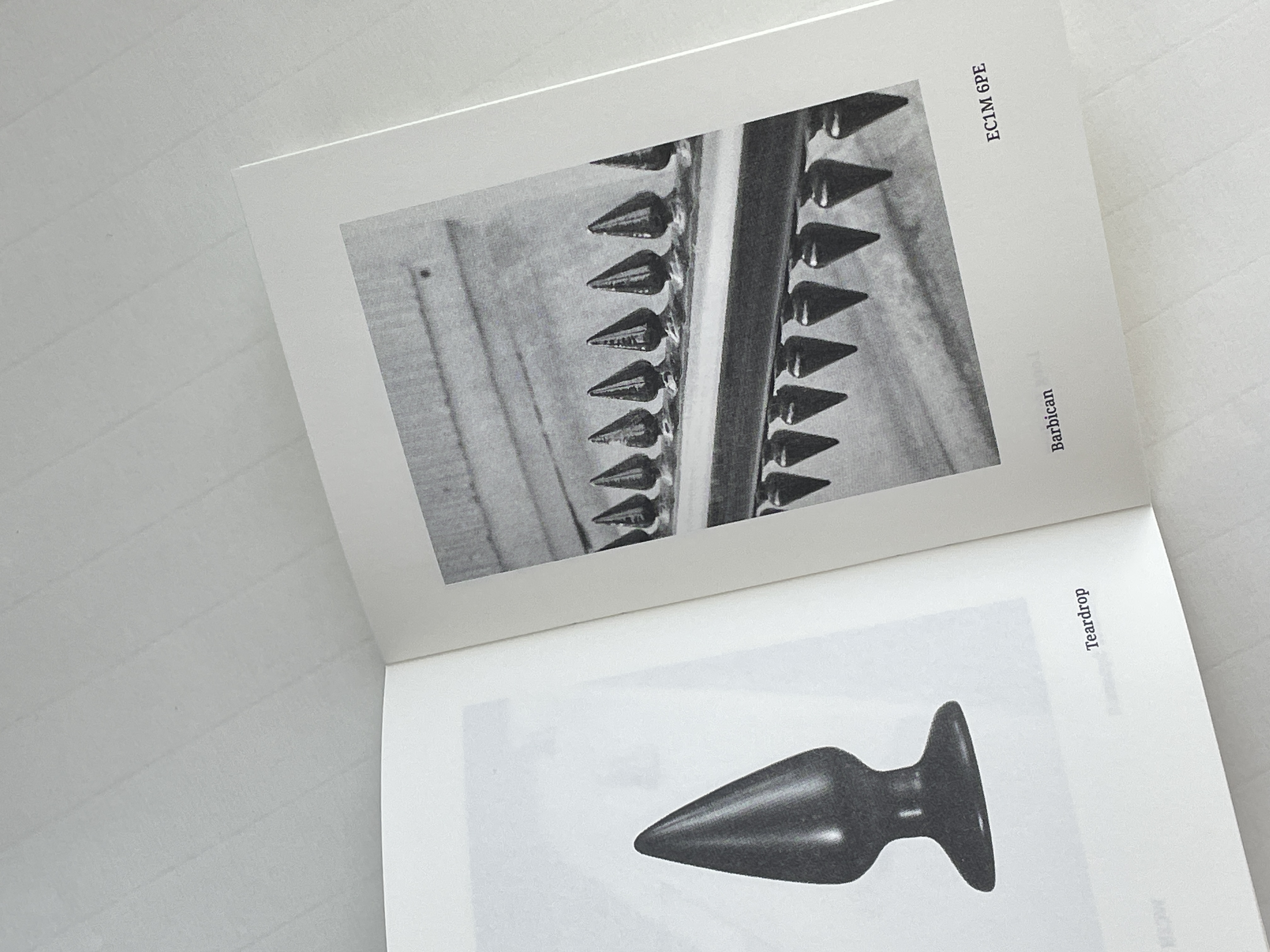 通过将真实存在且可在市面上购买的肛塞模型与敌意尖刺的照片并置,我并不是在发明一种比较,而只是指出一个已经存在的事实。两个形状如此相似的物体却能发挥完全相反的功能——前者热情邀请,后者冰冷拒绝。